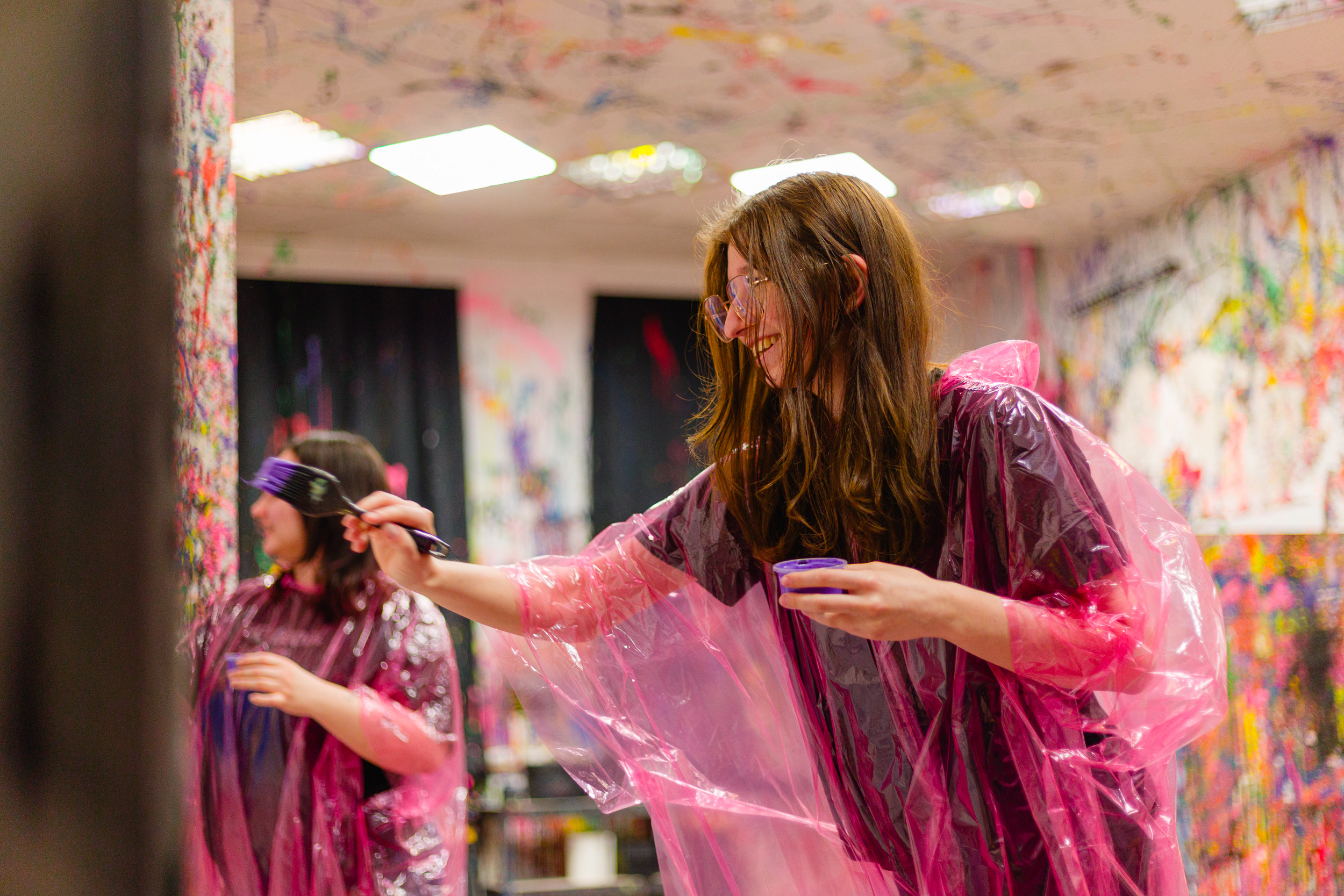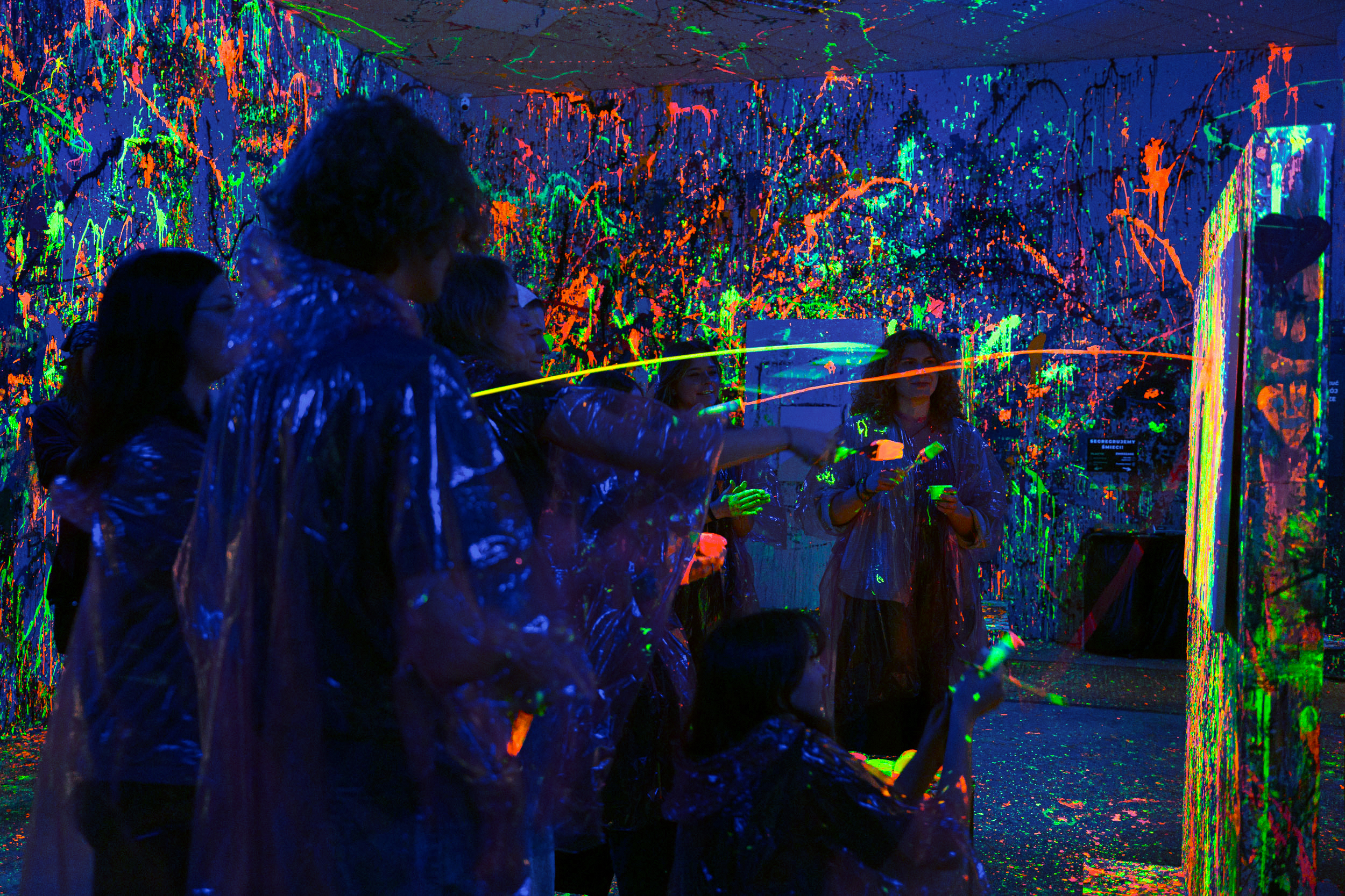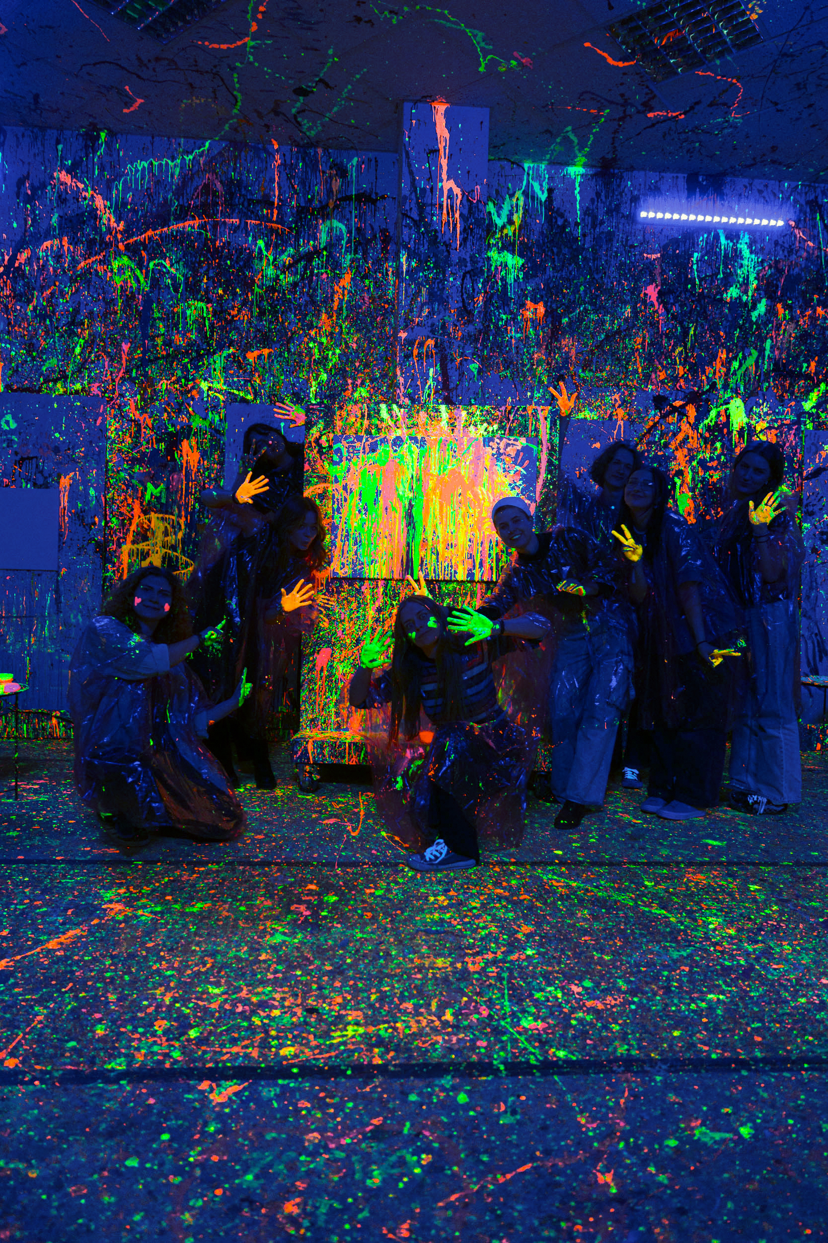 Do wyboru macie sesję zwykłą z wykorzystaniem zwykłego, naturalnego światła lub sesję FLUO, podczas niej zaciemniamy cały lokal i uruchamiamy lampy UV, natomiast do zestawu farb dostajecie fluorescencyjne, świecące kolory.
