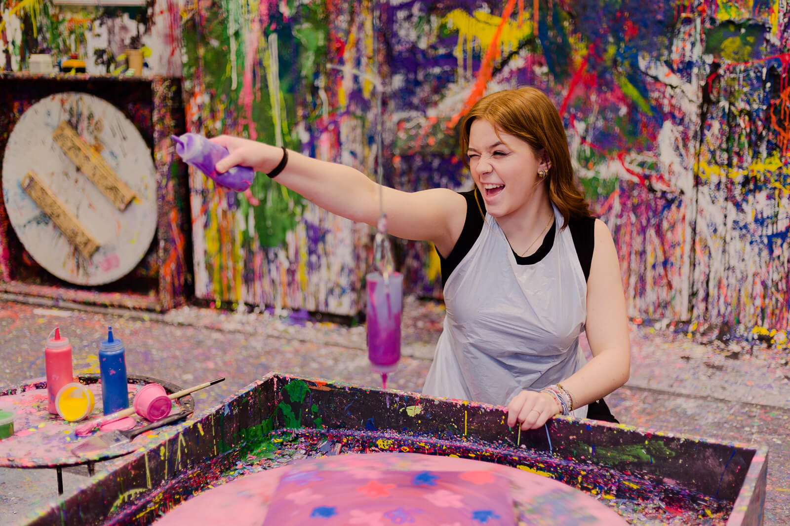 Voucher obejmuje jednorazowe uczestnictwo w sesji malarskiej w stylu action painting w wybranej technice i sesji (klasycznej lub fluo).